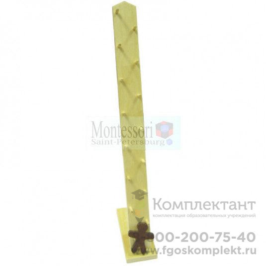 Подеревянной подставкев виде «лесенки», переваливаясь с боку набок, спускается деревянный человечек.
