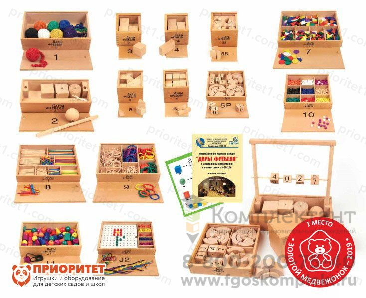 Дары Фребеля – это 14 разных наборов, сделанных по методике немецкого педагога. Комплект предназначен для развивающих занятий в детских садах. Для игры необходимо присутствие взрослого. Каждый «дар» упакован в отдельную коробочку с крышкой. Он направлен на развитие интеллекта, творчества и физических навыков.