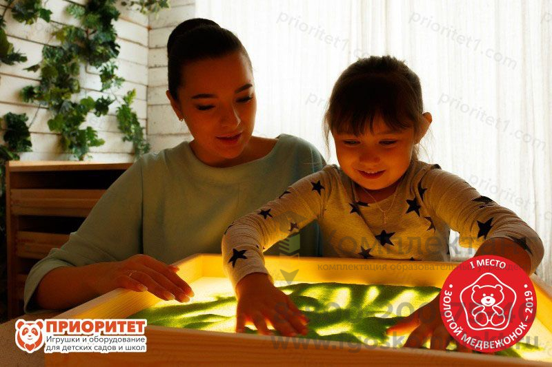 Песочная анимация имеет психотерапевтический эффект. На стол высыпается песок, включается подсветка. Лучше заниматься в приглушенном свете – так игра выглядит более зрелищно. Рисуя на песке, ребенок снимает стресс, получает приятные тактильные ощущения, развивает фантазию.