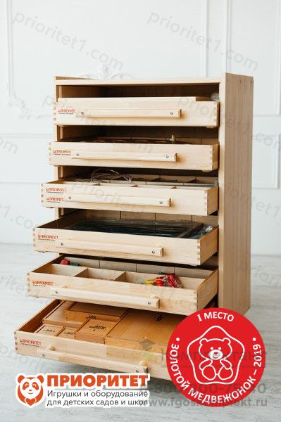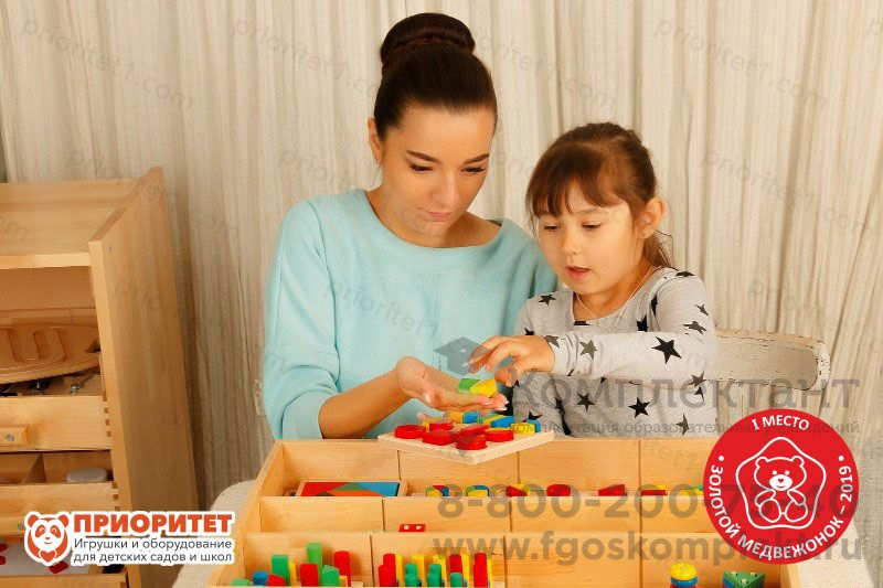 В деревянном ящичке с удобными отсеками разместили 14 комплектов дидактических игрушек, изготовленных из дерева. Они сделаны в точном соответствии с методикой Марии Монтессори. Занятия направлены, в первую очередь, на логическое мышление, счет, умение сравнивать и классифицировать. Параллельно развивается моторика пальцев, координация движений, фантазия, усидчивость. Ребенок запоминает названия цветов, фигур.