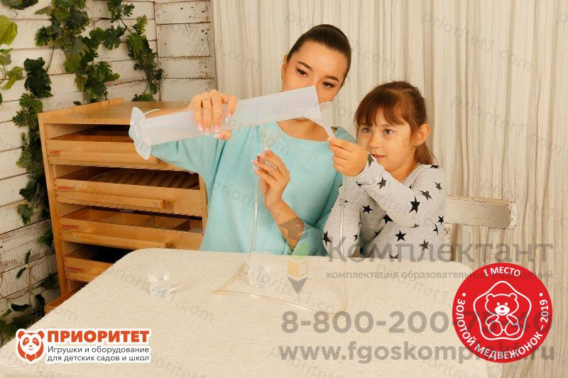 - Набор для переливания воды. Детям предлагается переливать воду из емкости с горлышком в прозрачный шланг. Для большего интереса воду переливают с разной высоты. Задача - знакомство с сообщающими сосудами.