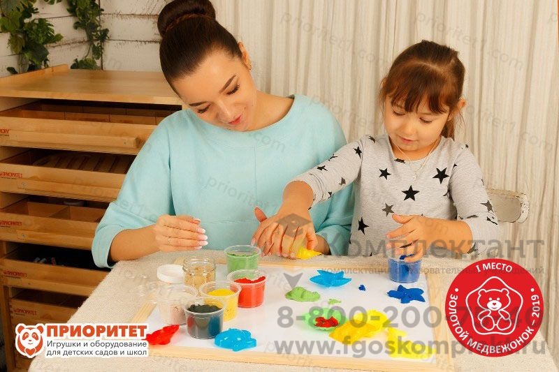 Благодаря специальному связующему веществу держит форму лучше обычного песка. При этом он не пачкает руки или одежду. Песок предназначен для развития воображения, творческих возможностей и навыков мелкой моторики.