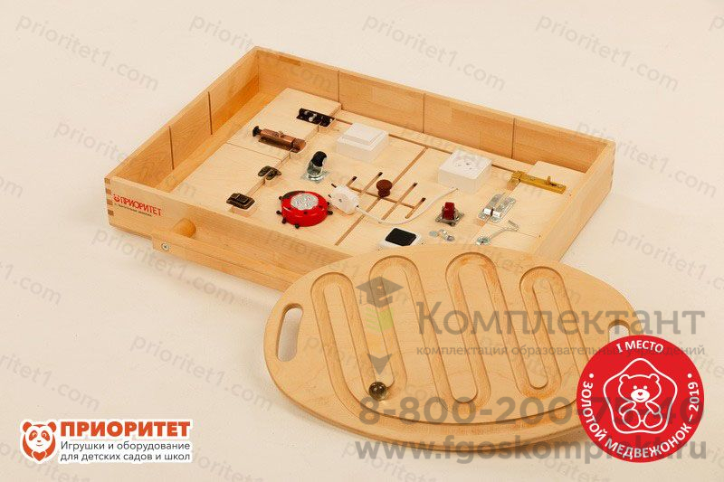 Округлая деревянная панель со сглаженными краями имеет рельефные ложбинки – маршрут. По ним катится металлический шарик. Необходимо довести шарик до конца маршрута, наклоняя доску. Для удобства предусмотрены две ручки по бокам.