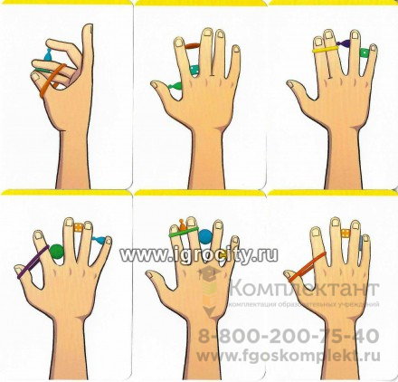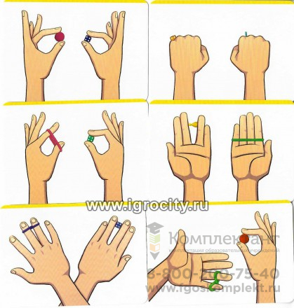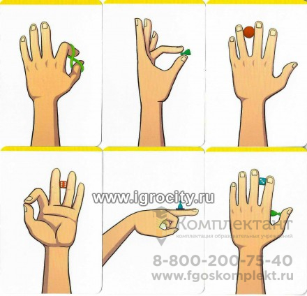 Как играть «Руки-трюки» — это настольная игра для развития мелкой моторики. На карточках нарисованы руки, удерживающие между пальцами мелкие предметы (жетоны, фишки, кубики, резиночки), рядом с каждым игроком лежат те же предметы, которые изображены на карточках. Задача игрока — быстрее соперника воспроизвести положения рук, удерживая предметы так, как изображено на карточках. Что в комплекте 80 карточек с изображением рук, держащих различные игровые предметы (20 карт для правой руки, 20 — для левой, 40 — для обеих рук); 8 игровых предметов: два кубика, два жетона, две резинки, две фишки; инструкция. Игра развивает мелкую моторику — необходимо точно воспроизводить изображенные на карточках положения рук; межполушарные связи и двуручную координацию — нужно выполнять движения то одной, то другой рукой, то обеими руками сразу; произвольный контроль и планирование — игроку требуется удерживать внимание и на карточке, и на своих руках, нужно определить порядок действий, в котором брать предметы будет наиболее удобно, и при этом следить за тем, чтобы они не выскользнули из рук; пространственные представления — нужно определить, какая рука изображена на карточке, какие предметы и как именно нужно удержать; способность переключаться — карточки для левой, правой и обеих рук перемешиваются в колоде и нужно быстро определять, какой именно рукой производить манипуляции; к тому же количество предметов на карточках разное (на одних — один-два предмета, на других — все четыре); память — в описанных ниже модификациях игры часто требуется запомнить положения рук и предметов и воспроизвести их по памяти. Кроме того, в этой игре, как и в любом другом соревновании, тренируется умение конструктивно обходиться с успехом или неудачей, что в свою очередь тесно связано с мотивацией к обучению. Составляющие любой игры — азарт и предвкушение успеха помогают справляться с неудачами (исправлять ошибки, продумывать новые стратегии) и усиливают мотивацию. Для обучения это очень важно. Сколько игроков может играть в игру "Руки-трюки" Игровой комплект рассчитан на двух игроков, не считая ведущего. На одного игрока приходятся одна резиночка, один кубик, один жетон и одна фишка. Предметы подобраны таким образом, что в случае их утери или если нужно увеличить количество играющих, предметы можно было бы легко заменить или дополнить. Кубик и фишка берутся из любой настольной игры, в качестве жетона можно использовать монетку или плоскую пуговицу, резинка тоже подойдет любая, но лучше, если это будет резинка для волос небольшого размер
