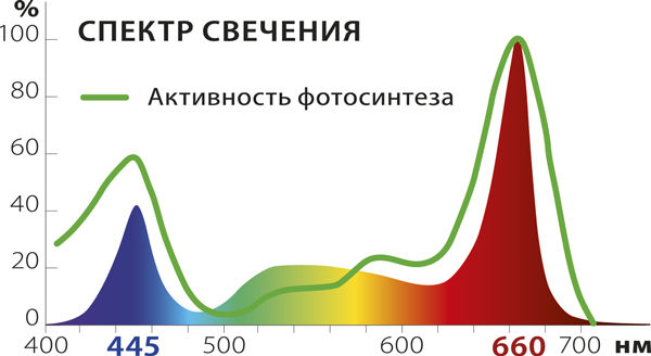 - Максимум красного и синего - оптимальный спектр для растений!