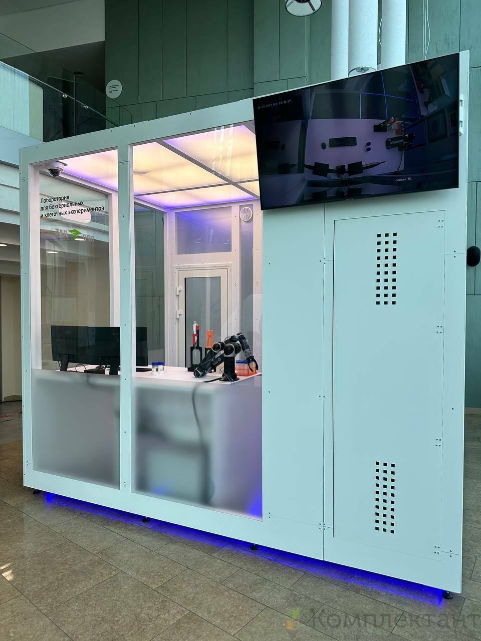 Внутренняя среда ограниченного прозрачными стенами чистого пространства Куба, укомплектованного культуральным оборудованием и фото-видеовыходами, имеет индивидуальную HEPA-вентиляцию