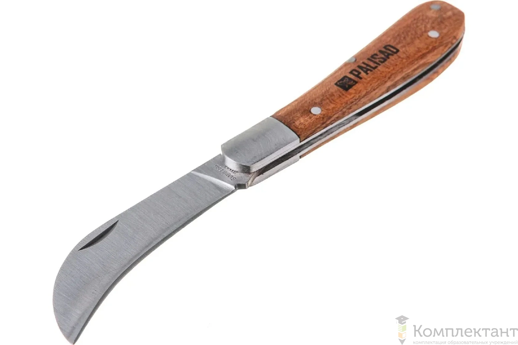 Складной садовый нож, имеет изогнутое лезвие серповидной формы.
