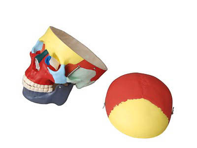 Модель высотой около 15 см, изготовлена из пластмассы. Модель позволяет продемонстрировать расположение костей черепа. Отдельные кости черепа выделены различными цветами, что позволяет четко различать их границы.
