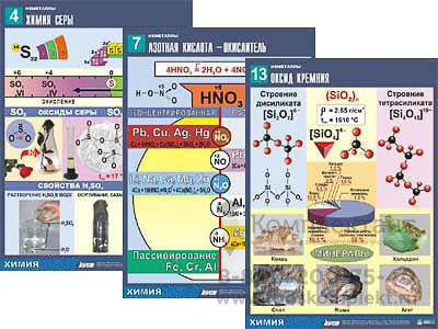 Комплект охватывает следующие темы: "Галогены", "Химия галогенов", "Сера. Аллотропия", "Химия серы", "Химия азота", "Оксиды азота", "Азотная кислота - окислитель", "Фосфор. Аллотропия", "Классификация минеральных удобрений", "Распознавание минеральных удобрений", "Углерод. Аллотропия", "Адсорбция", "Оксид кремния", "Силикаты", "Применение кремния и его соединений", "Инертные газы".