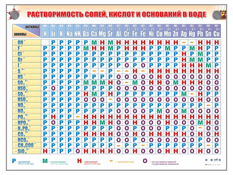 Справочно-информационный стенд - таблица (электронный, световой) "Растворимость кислот, оснований и солей в воде"