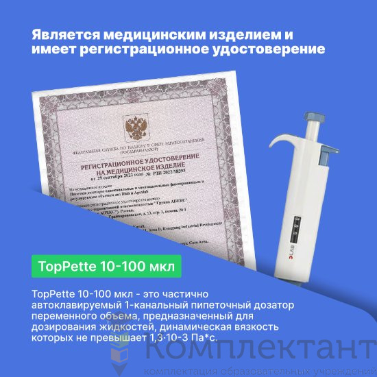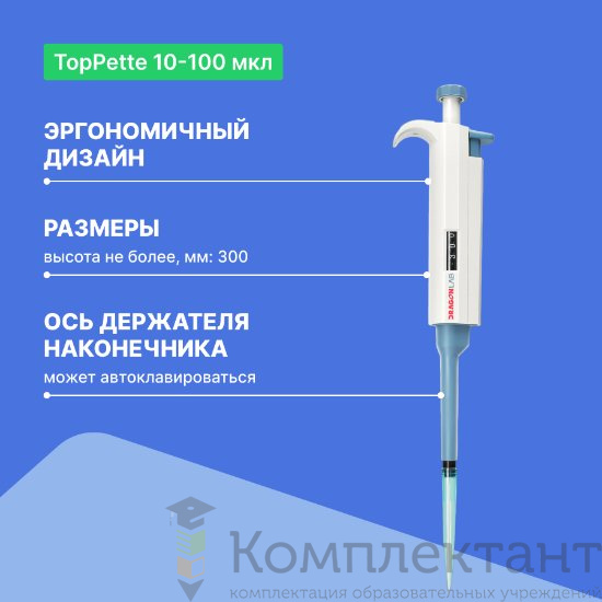 TopPette 10-100 мкл - это частично автоклавируемый 1-канальный пипеточный дозатор переменного объема, предназначенный для дозирования жидкостей, динамическая вязкость которых не превышает 1,3·10-3 Па*с.