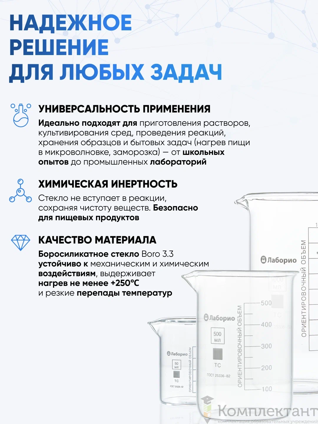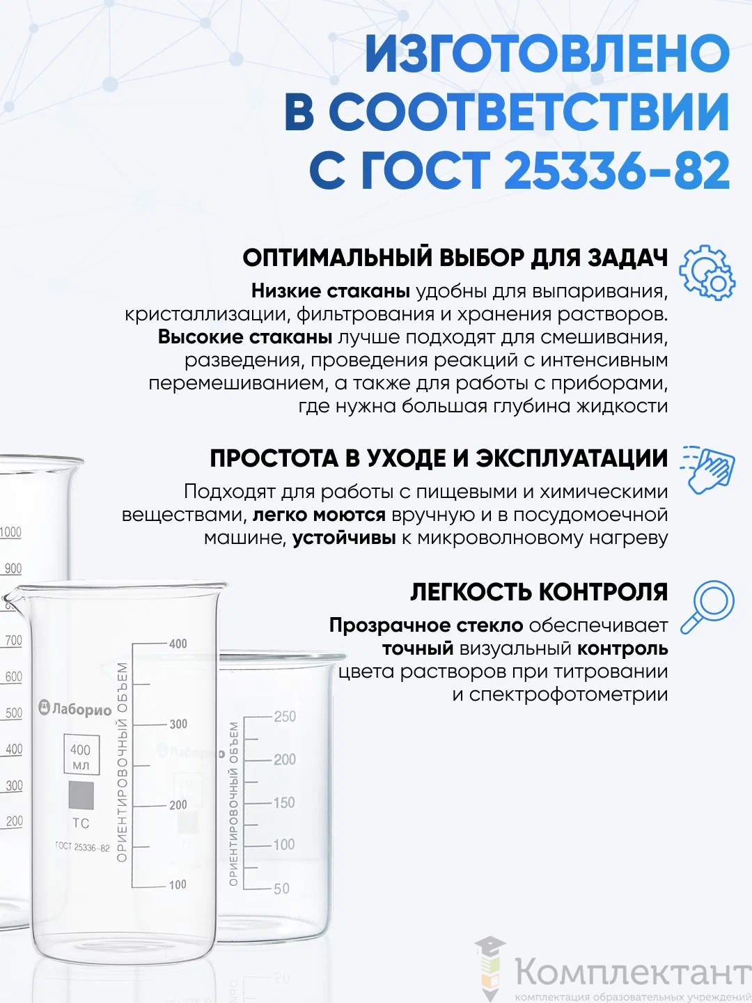 Стакан предназначен для проведения различных химических процедур. Такие сосуды используют для приготовления химических растворов, а также для фильтрования и выпаривания. Лабораторные стаканы с нанесенными делениями бело цвета удобны и практичны в эксплуатации, они широко применяются в медицине и химической промышленности. Стаканы производятся с носиком, имеют деления для приблизительного определения объема.