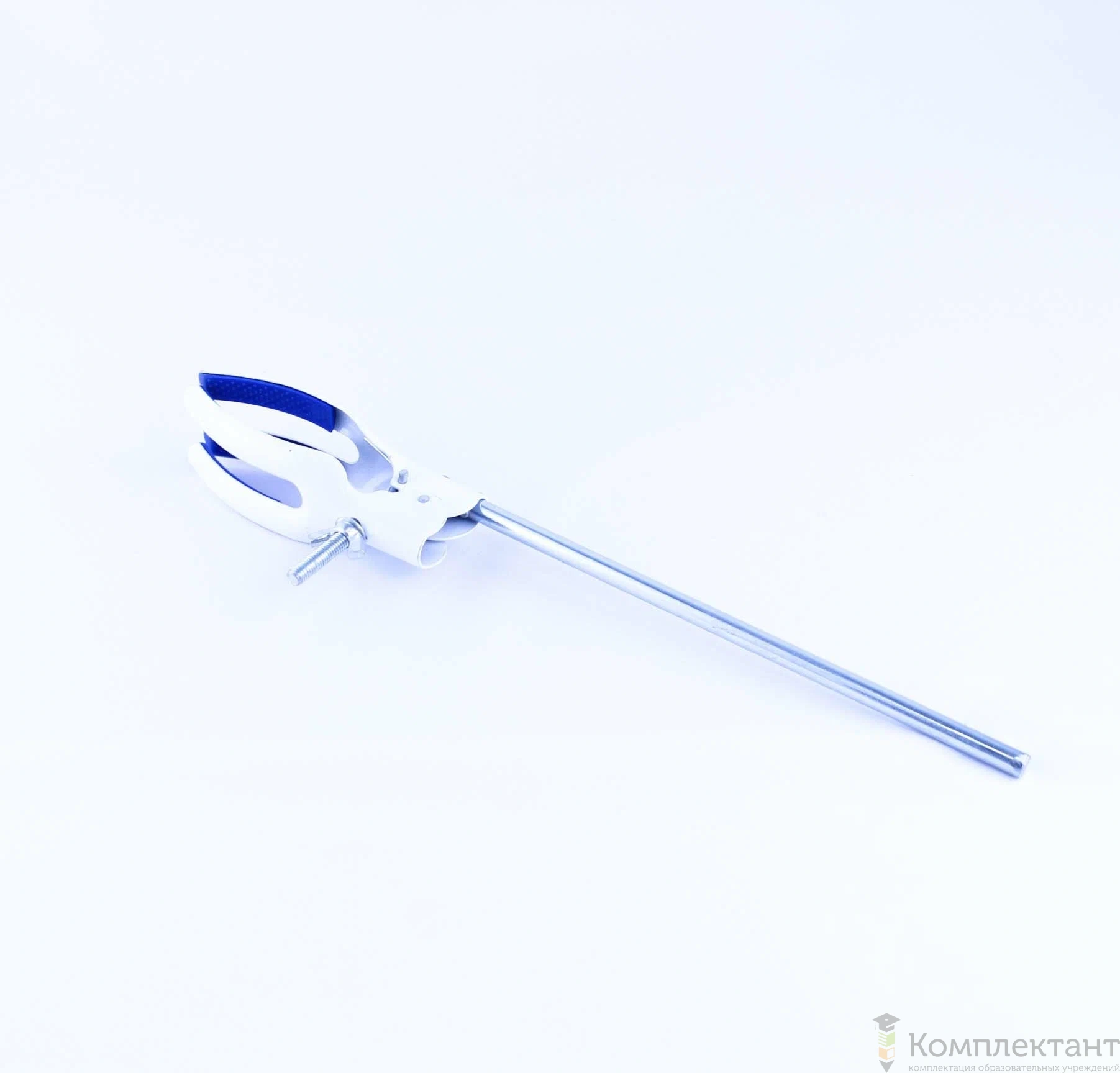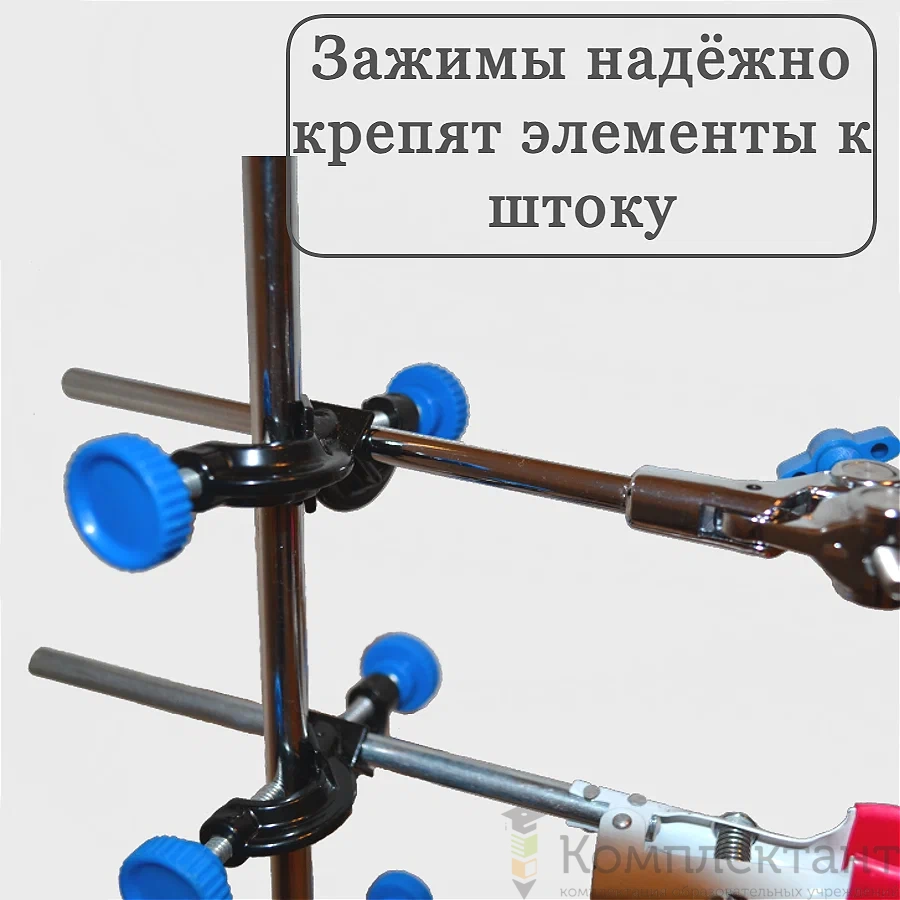 Зажим надёжно фиксирует составляющие между собой, тем самым минимизируя риск падения лабораторной посуды из штатива.