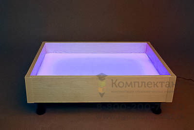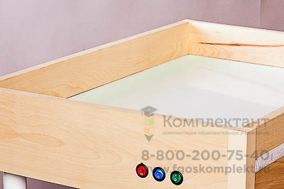 Экологически чистый настольный световой модуль изготовлен из бука. Наличие съемных регулируемых опор позволяет использовать модуль как на столе, так и на полу. Подсветка через молочное акриловое дно модуля делает работу с набором интересной и увлекательной. На боковой стенке имеются кнопки трех цветов (красного, синего, зеленого). Нажатие трех кнопок одновременно дает белый цвет подсветки; сочетание красной и синей – сиреневый цвет, красной и зеленой – желтый, зеленой и синей – голубой. Цветовые возможности модуля позволяют использовать его в процессе реализации различных видов деятельности детей.