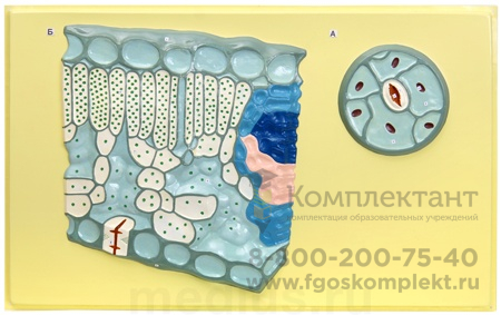 '> Модель «Клеточное строение листа» предназначена для демонстрации в общеобразовательной школе при изучении анатомического строения листа цветкового растения. Модель позволяет ознакомить учащихся с микроскопическим строением листа. Модель может быть использована при объяснении учителя, опросе учащихся.