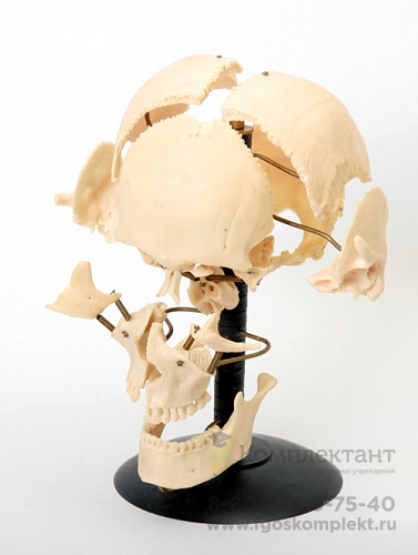 Модель «Череп с разрозненными костями, смонтированный на подставке» выпускается как демонстрационный материал при изучении строения черепа человека в средних и высших образовательных учреждениях.