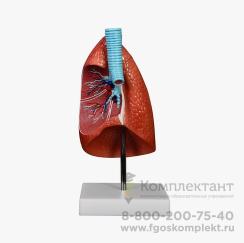 Демонстрационное учебное пособие представляет собой модель легкого человека в натуральную величину. На модели показаны бронхи, артерии, вены, лимфатические узлы. На подставке. Материал - пластик.