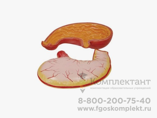Демонстрационное учебное пособие представляет собой модель желудка, увеличенную в 2 раза. Модель является разборной, изображает желудок человека в разрезе, показывает строение наружной и внутренней стен желудка. Материал - пластик.