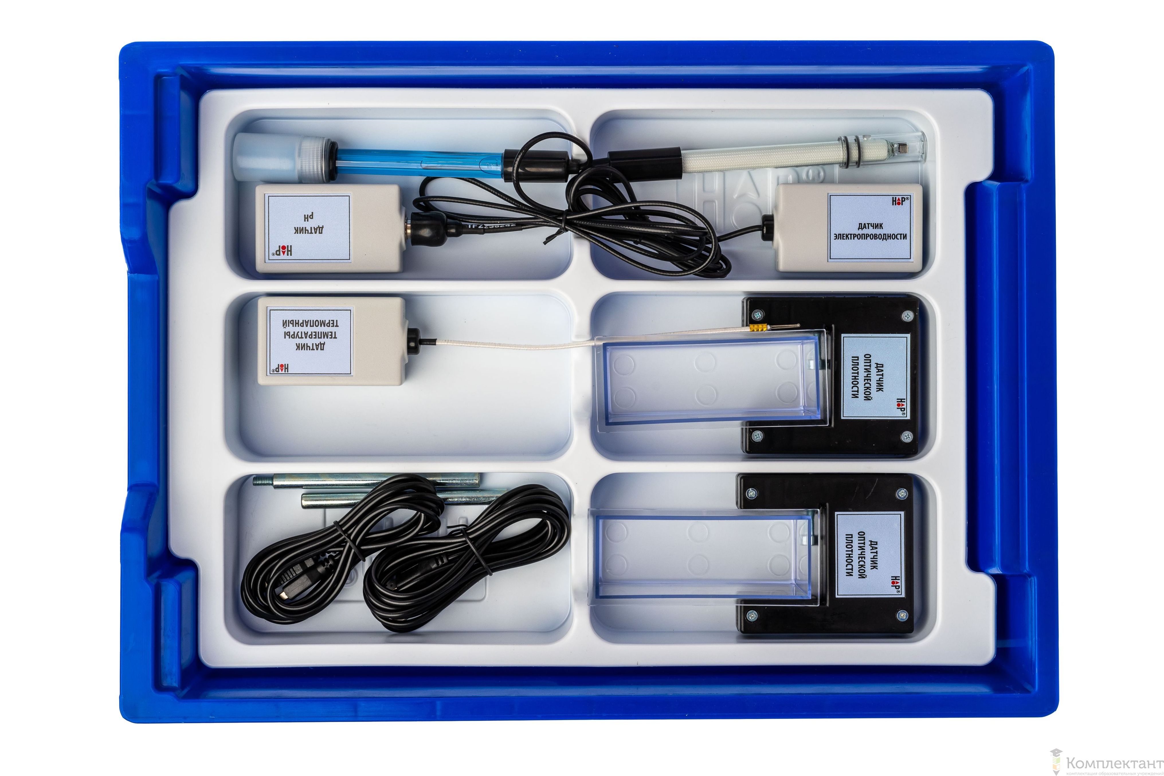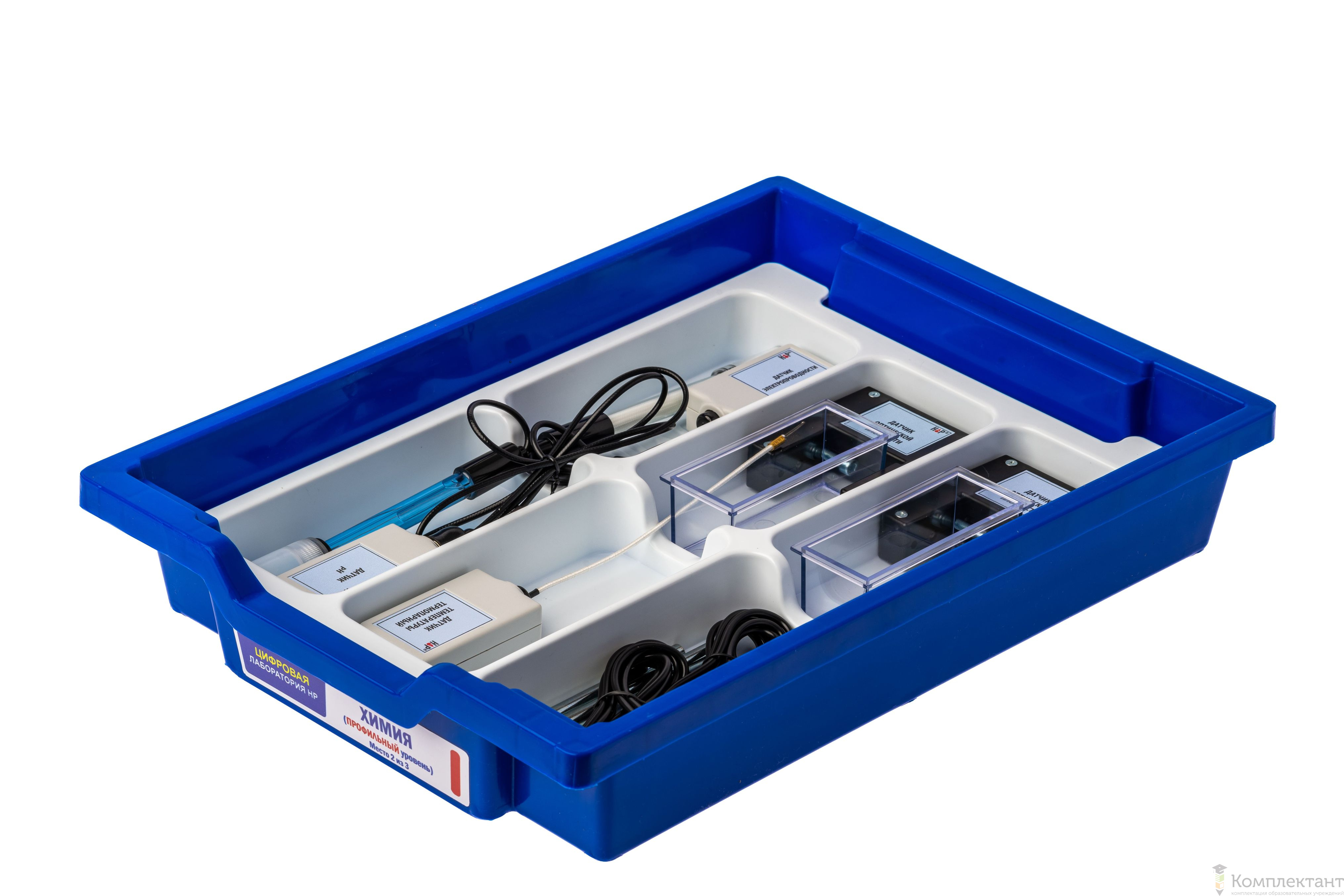 Цифровая лаборатория укомплектована в пластиковую систему хранения, которая закрывается прозрачной пластиковой крышкой на защелках для обеспечения наблюдения за содержимым. Комплект оборудования и датчики в системе хранения располагаются на ложементах.